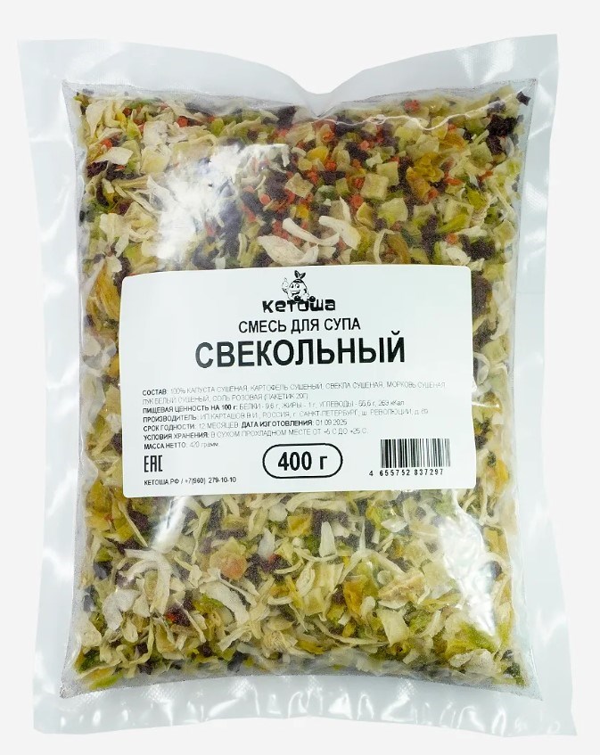 Состав: капуста сушеная, картофель сушеный, свекла сушеная, морковь сушеная, лук белый сушеный, соль розовая (отдельным пакетиком 20г).